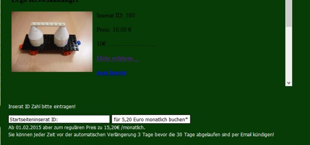 Ab 01.02.2015 aber zum regulären Preis zu 15,20€ /monatlich. Im Januar jetzt für 5,20€ /monatlich*. Sie können jeder Zeit vor der automatischen Verlängerung 3 Tage bevor die 30 Tage abgelaufen sind per Email kündigen! Nach Zahlung mit Lastschrift/monatlich wiederkehrend,wird in 24 Std. Ihr Inserat eingetragen in das Widget. Informationen unter Rechnung@eisenbahnkartei.de und Eisenbahnkartei.de.   *gemäß Kleinunternehmer-Regelung Weiterlesen »